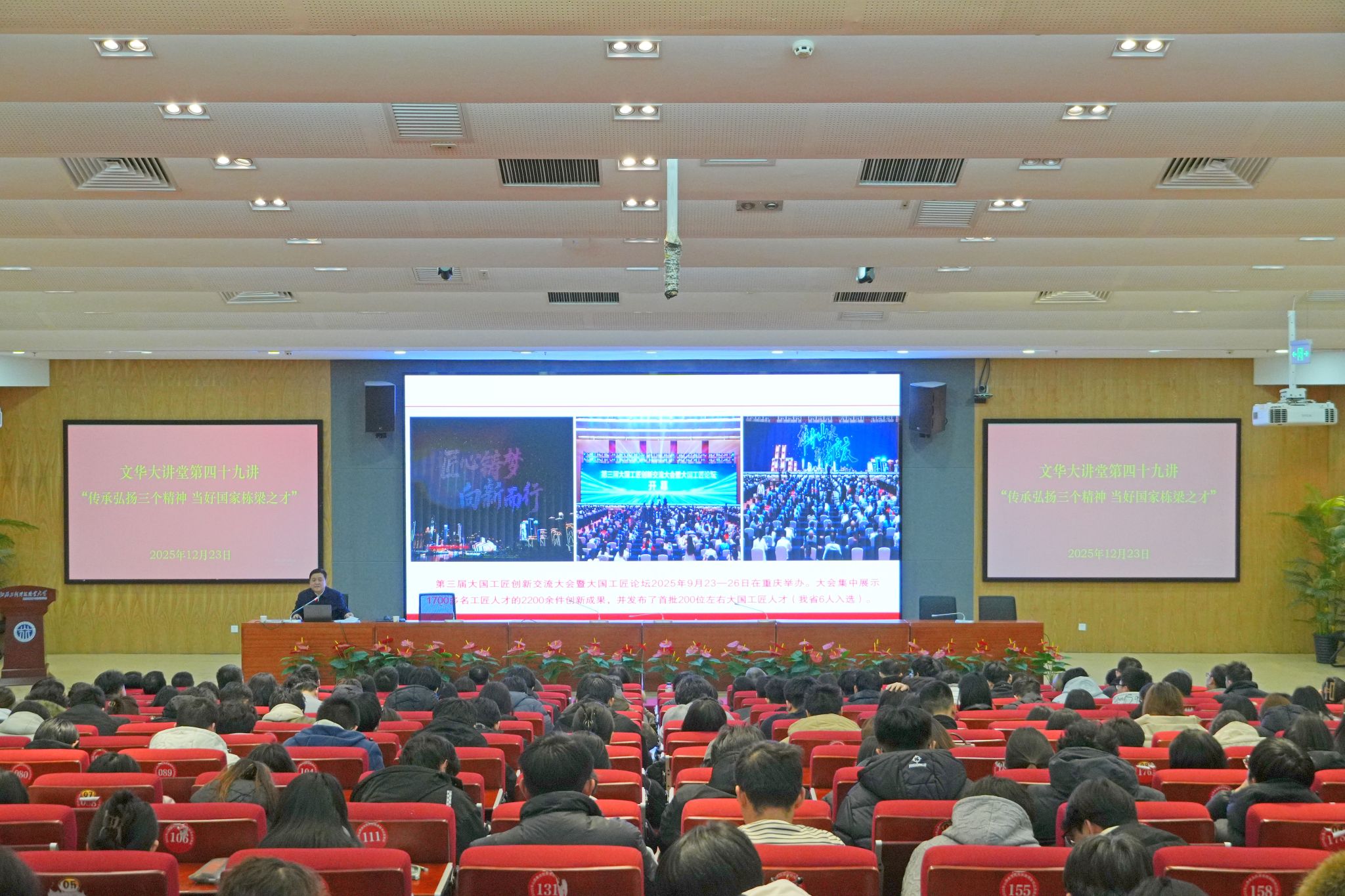 12月23日,我校举办以“传承弘扬三个精神 当好国家栋梁之才”为主题的“文华大讲堂”第四十九讲专题思政课。省委社会工作部副部长、新闻发言人,省政协常委、总工会界别召集人,中北大学特聘教授李忠贵来我校为现场师生讲授了一堂兼具思想高度与实践温度的专题思政课。校党委副书记梁晓军出席并主持。